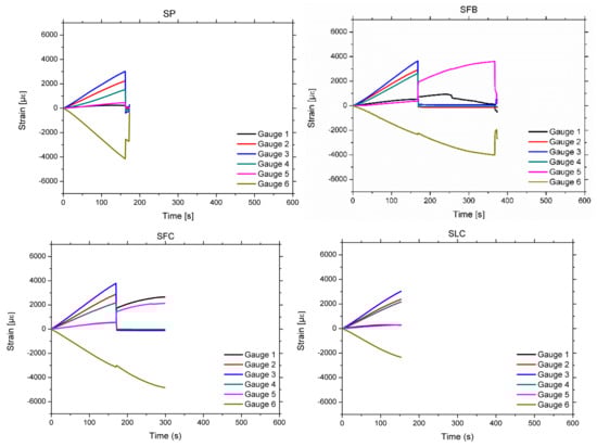 Experimental strain-time plots for all the specimens. See [] for the position of the strain gauges.