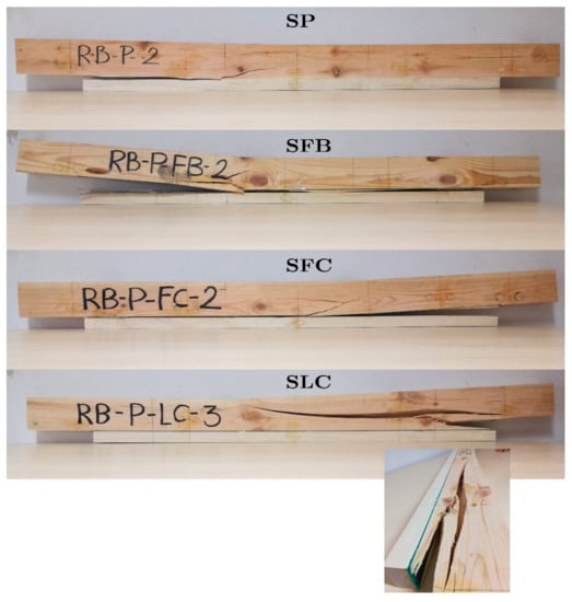 For the case of the SP specimen, it can be observed that the strain increases permanently until the end of the test. In this case, the final failure was caused by a strong pine-poplar delamination starting on the left side of the poplar plank, followed by a mixed brittle tensile/shear fracture of the pine located around the mid-span (tension zone of the pine). However, for the case of specimens retrofitted with the fabric FRP (SFB and SFC), the strain increases permanently up to a particular intermediate load point at which a complete delamination between the FRP fabric and the poplar plank occurs. Moreover, at this point there is a sudden drop of the load and the strain, particularly in the tensile area with the strain at the poplar plank becoming very low because it gets detached. After this drop, a gradual new rise of the load occurs until the final brittle fracture of the pine beam (tensile mode for the SFB specimen and mixed tensile/shear mode for the SFC one), is located at the mid-span of the sample. This ductile behavior of the fracture process is very important in terms of safety. Finally, for the sample with LC retrofitting, the strain increases permanently until the end of the test. Final failure occurred by a very slight pine-FRP delamination at the right side of the poplar plank, followed by a strong brittle shear fracture of the pine, which extended along 2/3 of the length of the specimen. Table 5 summarizes the failure modes of the specimens and Figure 8 shows some pictures of the fracture pattern for each particular sample.