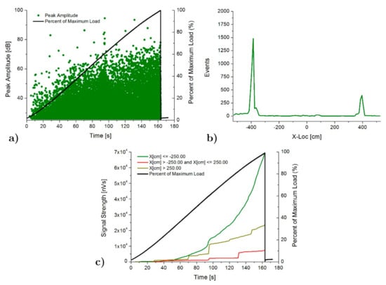 Figure 9 shows the AE results obtained for the SP specimen. Peak amplitude in dB (Figure 9a) shows a gradual increasing as the load increases until the end of the test, demonstrating a progressive deterioration of the specimen. Second plot, Figure 9b, shows the location results of the AE events as a function of position along the specimen. A clear concentration of events is observed at both ends of the poplar planks, which is clearly due to the strain concentration in these areas, demonstrated by the numerical analysis (Figure 4). Higher concentration is observed on the left side, which is in good agreement with placement of the beginning of pine-poplar delamination occurred at this side, experimentally observed (Figure 8). In order to compare the zonal distribution of the AE intensity, Figure 9c shows the AE signal strength located on the left side (x < −250 mm), right side (x > 250 mm), and central area (−250 < x < 250 mm) of the specimen. Few AE is located in the central area in this case, which appeared mainly at the end of the test.
