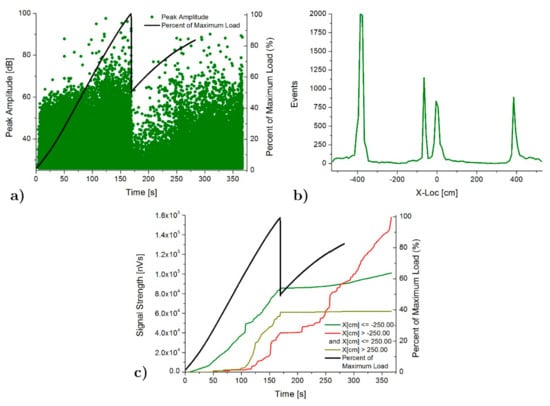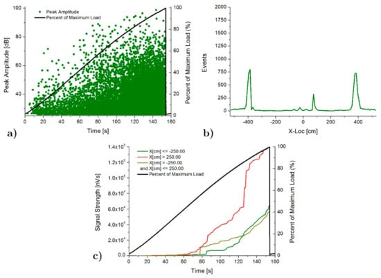 AE results for SLC specimen: (a) Peak amplitude vs load history over the time, (b) Linear location over the specimen and (c) Signal strength vs load history over the time.