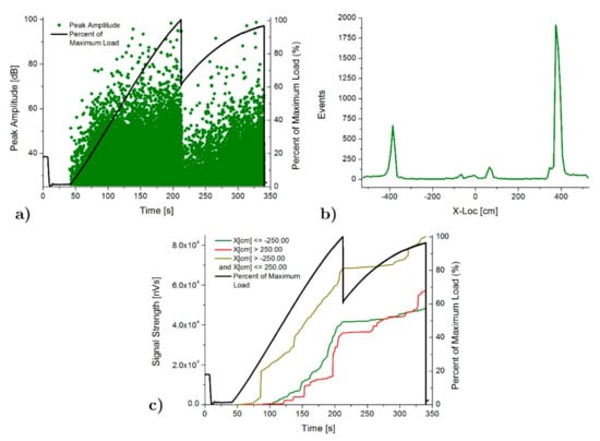 AE results for SFB specimen: (a) Peak amplitude vs load history over the time, (b) Linear location over the specimen and (c) Signal strength vs load history over the time.