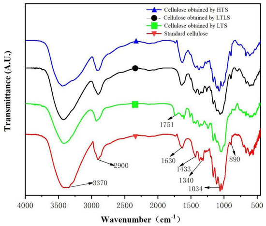 Infrared spectra of standard cellulose and other samples obtained using the LTLS, LTS and HTS are shown in Figure 1. The red curve is the infrared image of standard cellulose. The absorption peak at 3370 cm−1 is attributed to the stretching vibration of –OH in cellulose. The absorption peak at 2900 cm−1 represents the stretching vibration of CH in cellulose. 1640cm−1 is the O–H bending vibration caused by the hydrogen bonding of water in cellulose, indicating that standard cellulose contains water [28]. The absorption peak at 1340 cm−1 is the stretching vibration peak of –CH2 in cellulose. The absorption peak at 1034 cm−1 is the stretching vibration of C–O–C in cellulose. The bending vibration of C–H in cellulose produces an absorption peak at 890 cm−1, which is a special absorption peak of cellulose-I structure [29]. The products of HTS and the LTLS are the same as the characteristic peaks detected in the infrared spectrum of standard cellulose. LTLS performed under low temperature reaction conditions effectively extracted cellulose from corn straw at high purity. The LTS product showed an absorption peak at 1751 cm−1, which is a characteristic peak of the stretching vibration of the nonconjugated C=O in lignin [30]. Thus, the LTS product contains lignin. However, the cellulose obtained using the LTLS did not show a new absorption peak at 1751 cm−1, indicating that the introduction of laccase successfully removed the lignin that remained after extraction with the LTS.