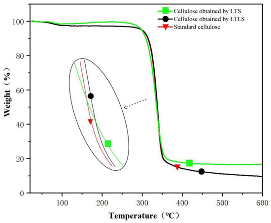 As shown in the TG spectra (Figure 2) standard cellulose evaporated water at 100 °C The cellulose decomposed quickly at 300 °C and decomposed completely at 500 °C. The final sample contained 8% ash. The curve of the product extracted using LTLS is the same as standard cellulose. The ash content of the LTS product after combustion was 20%, which is higher than standard cellulose, indicating that the LTS product contained more lignin. The benzene ring structure in lignin is not completely burned at 600 °C; therefore, the end of the TG curve of the LTS product shows a large amount of remaining ash. After the addition of laccase, the ash content in the LTLS product was significantly lower than the LTS product. The TG curve of the LTLS product was the same as the standard cellulose sample, and the residual amount of ash was 10%. We concluded that the introduction of laccase effectively removes lignin from the corn straw, increasing the purity of the extracted cellulose. The LTLS successfully extracts high-purity cellulose under low temperature conditions at a high yield.