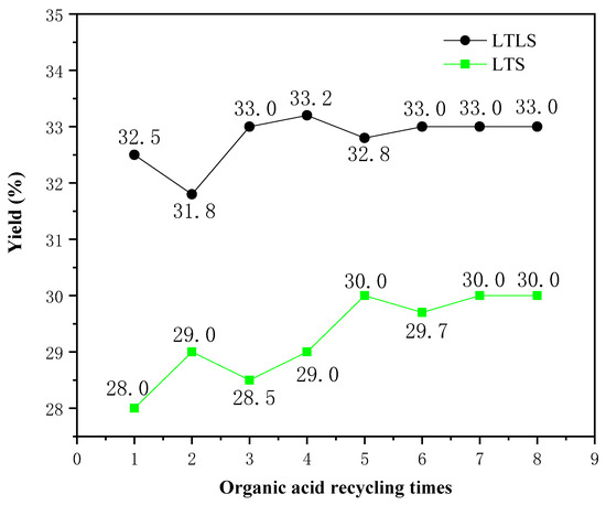 The effect of recycling the mixed organic acid solution on the yield was studied. The relationship between the number of recycles and the yield is shown in Figure 4. The yields of LTLS and LTS increased as the recycle number increased, due to the weakening ability of the organic acid mixture to hydrolyze cellulose. The yields of LTLS and LTS increased significantly when the mixed organic acid solution was used one to four times, because the mixed organic acid solution hydrolyzed some of the incompletely crystallized cellulose. When the mixed organic acid solution was used four times, the yields of LTS and LTLS both reached a stable value, indicating that the organic acid mixture had optimally removed the hemicellulose. Based on these results, the effect of recycling the mixed organic acid solution on the yield is small, confirming that the recycling the mixed organic acid solution is feasible. Moreover, the experiment in which the solution was recycled eight times reduced at least 800 mL of waste liquid discharge, reducing the pressure of waste liquid treatment on cellulose extraction. Finally, we also recycled and reused the mixed organic acid solution by distillation to result in zero waste liquid discharge. Thus, we propose that LTLS is a new, environmentally-friendlysystem for extracting cellulose from corn straw.