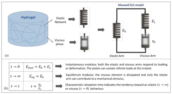 The native extracellular matrix (ECM) is a biphasic material composed of structural elements that confer tissue mechanical strength, stiffness and elasticity, surrounded by an aqueous solution of hyaluronic acid, proteoglycans and glycoproteins, responsible for the viscous behaviour [1,2,3]. Thus, its overall mechanical behaviour is viscoelastic and typically varies over time since biological tissues are continuously subjected to either physiological remodelling processes, such as growth and ageing, or pathological ones—for example, in the case of traumatic events or diseases [4,5,6]. Notably, as the timescales typical of pathophysiological processes are longer than those of the viscoelastic phenomena observed in gels, the evolution of elasticity or viscoelasticity associated with these processes can be studied or mimicked in tissues and materials.