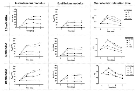 Instantaneous (Einst) and equilibrium (Eeq) elastic moduli and characteristic relaxation times of GTA-crosslinked gelatin hydrogels incubated with mTG for 1, 4, and 7 days. Error bars are scarcely visible due to their very low values (SEM values are reported in the Supplementary Materials).