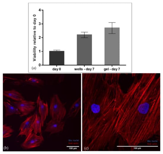 As shown in Figure 4a, no significant differences in cell viability were observed on the gels with respect to polystyrene wells. Figure 4b,c demonstrate that cells adhere and thus spread on the gels expressing well-defined actin fibers.