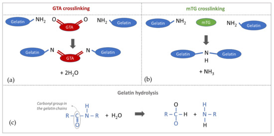 Schematic of gelatin crosslinking with (a) glutaraldehyde (GTA) and (b) microbial transglutaminase (mTG); (c) Schematic of gelatin hydrolysis reaction.