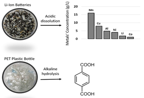 By combining the PET and LiNMC (Ni, Mn, Co) waste streams, we have laid the foundation for an integrated recycling process, leading to potential high-value products (such as Al MOFs). The work was done on real waste—plastic bottles used for regular water and crushed lithium Mn–Ni (LMN) batteries—as depicted in Figure 1.