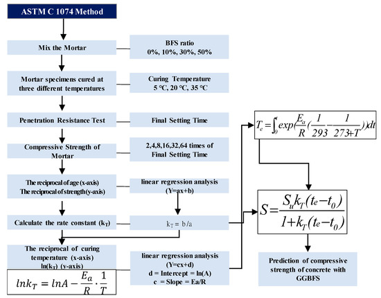 The final setting time of the mortar cured at three different temperatures is measured. The compressive strength of mortar is measured at 2, 4, 8, 16, 32 and 64 times as the final setting time. By plotting the reciprocal of the age(x-axis) versus the compressive strength (y-axis), the y-intercept of the linear regression line can be obtained from the regression analysis. Ea can be calculated by plotting the reciprocal of the curing temperature(x-axis) versus the reciprocal of lnkT (y-axis) and dividing the gradient of the linear regression line obtained from the regression analysis. The equivalent age can be calculated by Ea of GGBFS concrete from Equation (5), and the compressive strength development is analyzed by the calculated equivalent age and kT from Equation (6).