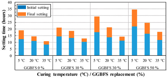 Setting time of mortar, according to curing temperature and replacement ratio of GGBFS.