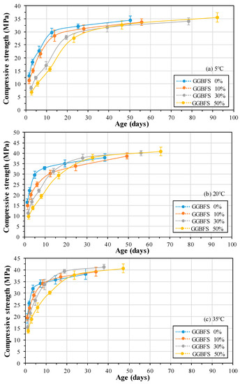 Compressive strength of mortar, according to curing temperature and replacement ratio of GGBFS (a) 5 °C, (b) 20 °C, (c) 35 °C.