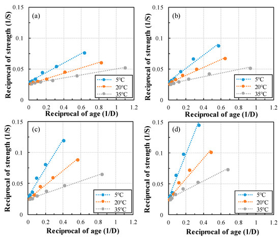 The maturity function is expressed in linear Equation (2) considering temperature and the age [10], whereas, the equivalent age can be calculated by Arrhenius chemical reaction rate (Equation (3)) [12,13,24].