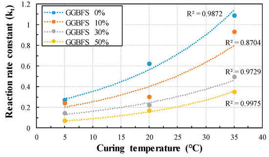 The effect of temperature on the rate constant with GGBFS replacement ratio.