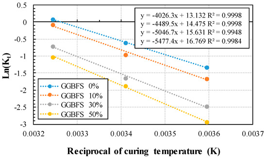 By taking the natural logarithm of the calculated kT and plotting the reciprocal of the curing temperature (K), we can represent the Arrhenius plot, as shown in Figure 6. The gradient of the linear regression line of each GGBFS replacement ratio represents Ea/R, and the y-intercept represents the value of ln(A). As the GGBFS replacement rate increases, the gradients of the linear regression line decreases to a negative value.