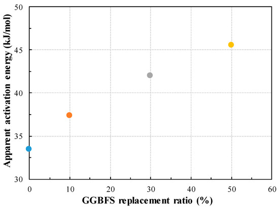 Figure 7 shows the Ea results of GGBFS replacement ratio. As the GGBFS replacement ratio increases, the Ea increases linearly, which considered as the result of an increase in the minimum energy for the chemical reaction of cement, GGBFS and water. For OPC mortar, Ea is estimated to be 33.475 kJ/mol, which is very similar to the proposed value of Freisleben-Hansen and Pederson, i.e., 33.5 kJ/mol [13]. Wirkin et al. have found that superplasticizer has a little role on the hydration kinetics of cement and the difference in Ea, with or without the superplasticizer, is insignificant, i.e., 3 kJ/mol [44]. In the present study, the Ea value of 10%, 30% and 50% GGBFS is found to be 37.325 kJ/mol, 41.958 kJ/mol and 45.541 kJ/mol, respectively.