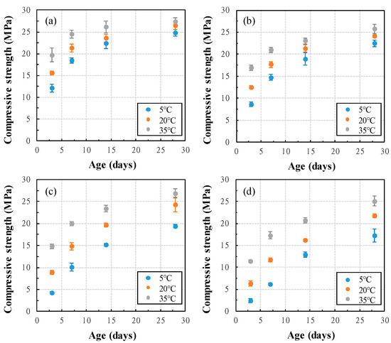 Compressive strength of concrete with curing temperature and GGBFS replacement ratio (a) 0%, (b) 10%, (c) 30%, (d) 50%.