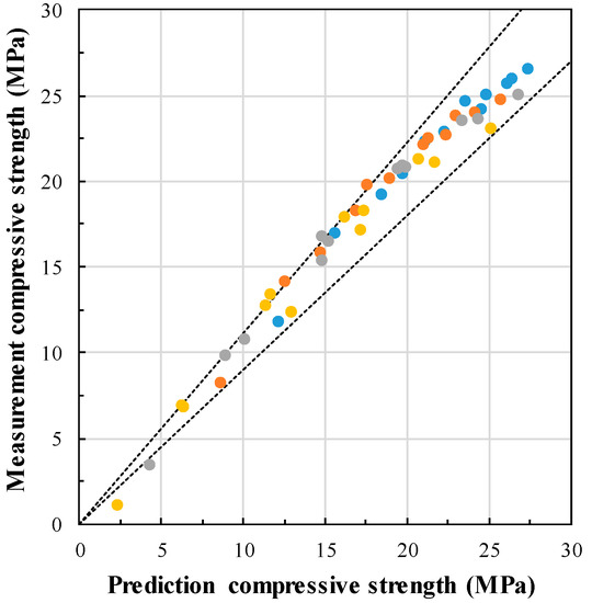 The maturity model applied in this study is the equivalent age model, as shown in Equation (5), and the equivalent age was derived using calculated Ea. The compressive strength prediction, according to the equivalent age by GGBFS replacement ratio, is shown in Figure 9. From this figure, it is found that the compressive strength at an early age is delayed as GGBFS replacement ratio increased. The compressive strength development prediction curve approximately overestimates the compressive strength, but similarly simulates the delayed expression of initial compressive strength, due to the increase of GGBFS replacement ratio. Figure 10 compares the predicted compressive strength with the measured compressive strength. The compressive strength is predicted similarly in all compressive strength regions. Thus, very high correlation (R2 = 0.91) is obtained. This proves that the compressive strength of concrete can be predicted in all strength at various curing temperatures and GGBFS replacement ratio.