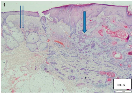 Histological findings of SCC in H and E-stained slide. Note the invasion of dermis by atypical keratinocytes with squamous eddies and pearls and dyskeratosis in the tumor (arrow) and the normal tissue (2 arrows).