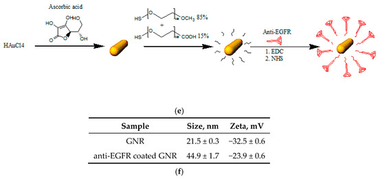 Using a spectrophotometer, the GNSs extinction coefficient spectrum was determined, and the resultant extinction peak was 530 nm (Figure 2c). The resultant average shape was 20 ± 4.3 nm (Figure 2d). The GNRs bioconjugation to anti-EGFR was also validated by zeta potential and dynamic light scattering (DLS) measurements (Figure 2f).