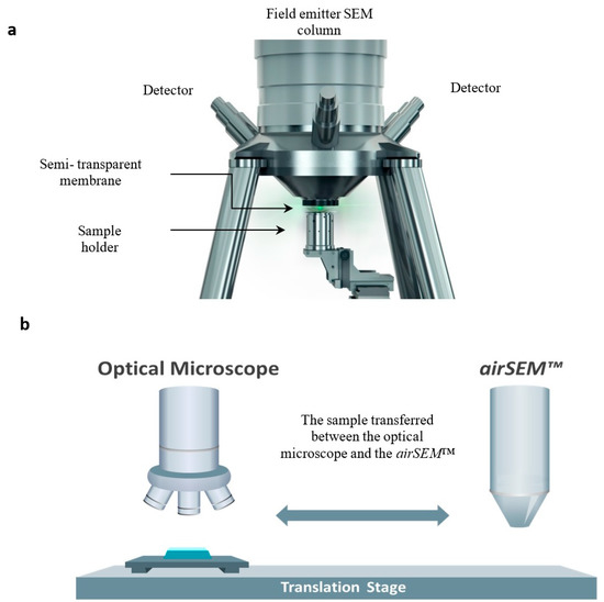 Schematic view of the air scanning electron microscope (airSEM) (a) and an imaging station operating principle (b). The two visualizing modalities are combined onto one platform. The sample is shuttled between the optical microscope and airSEM, which provides accurate navigation and continuation of magnification of the region of interest (ROI).