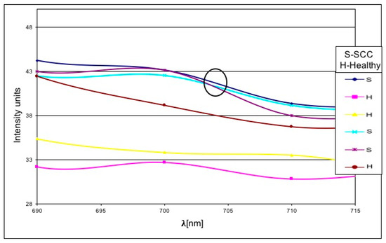 Reflectance spectra values in three tumor sites and three tumor-free sites. Focused view of second peak wavelength of the particle measured in the graph. Note the values in the area of the SCC.