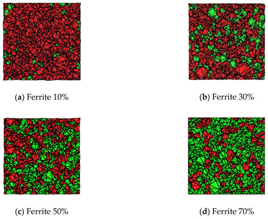 The grain structure of PZT matrix ferroelectric composites with different volume ratios after subdivision. (red grains are PZT, and green grains are ferrite).