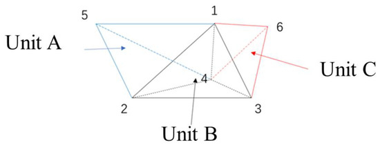 As shown in Figure 6, the small model consists of three tetrahedral units. For the tetrahedral Unit A, it consists of four nodes: 1, 2, 4, 5; for the tetrahedral Unit B, it includes four nodes: 1, 2, 3, 4; for the tetrahedral Units C, it includes four nodes: 1, 2, 3, 6. Then, based on the fixed-solution condition, the linear equations of the potential of the model nodes can be built. The solution conditions are set herein: