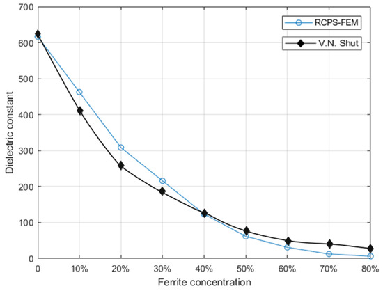 According to the above results, it can intuitively see that the larger the volume ratio of Ferrite particle is, the smaller the macroscopic dielectric constant is. Where the black line is Shut, V. N’s experimental result [31].