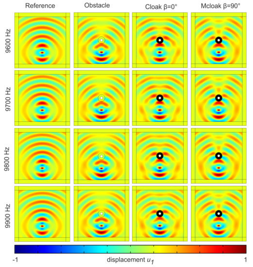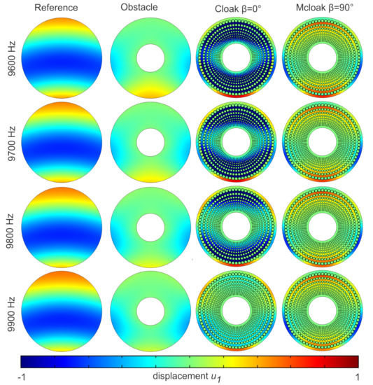 - Kadic, M.; Wegener, M.; Nicolet, A.; Zolla, F.; Guenneau, S.; Diatta, A. Elastodynamic behavior of mechanical cloaks designed by direct lattice transformations. Wave Motion 2020, 92, 102419. [Google Scholar] [CrossRef]