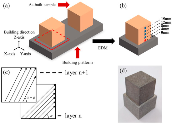 (a) Schematic representation of electrical discharge machining (EDM) processing on as-built samples. EDM cutting path are represented by red lines. (b) Schematic representation of XRD measuring points. Measurements at 0 mm (red area) on same sample before and after surface finishing were used to evaluate the effect of surface roughness on XRD measurements. Four additional measurements (blue area) were performed on surface finished sample to acquire residual stress distribution. (c) Representation of scanning strategies (starting angle α and rotation angle between subsequent layers β). (d) As-built sample cut together with building platform.