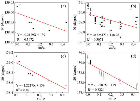 Taking 2θ and sin2ψ as ordinate and abscissa axis, the XRD data are plotted for measurements performed on as-built samples (Figure 3a,b) and chemical-etched samples (Figure 3c,d). Data points of single measurement are shown in Figure 3a,c while a superposition of all data points obtained in eight measurements is shown in Figure 3b,d. The slope of 2θ-sin2ψ straight line is obtained by linear fitting using ORIGIN standard software. The fitted relationship and corresponding coefficient of determination R2 are also plotted. Statistics of values obtained from XRD measurements are shown in Table 4, including the slope and the coefficient of determination (R2) of the fitted 2θ-sin2ψ line as well as the resulting residual stress. The average and the standard deviation were calculated based on results of eight measurements.
