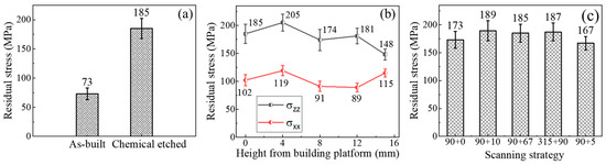 Figure 4a shows the residual stress measured using XRD before and after surface treatment at same position (red area in Figure 1b) of the same sample. Value measured on chemical-etched sample (185 ± 16 MPa) is about 2.5 times larger than that measured on as-built sample (73 ± 10 MPa). Figure 4b shows the residual stress distribution on lateral surface of the chemical etched sample. σzz increased in magnitude to a peak value of 205 ± 15 MPa at 4 mm from the building platform and then decreased until reaching a minimum of 148 ± 9 MPa at 15 mm. σxx showed a similar tendency with a maximum of 119 ± 9 MPa and a minimum of 89 ± 8 MPa, except a sharp increase in magnitude at 15 mm. Residual stresses measured on samples produced with five different scanning strategies are summarized in Figure 4c. The measured values of σzz presented a rather constant tensile stress with an average of about 180 MPa.