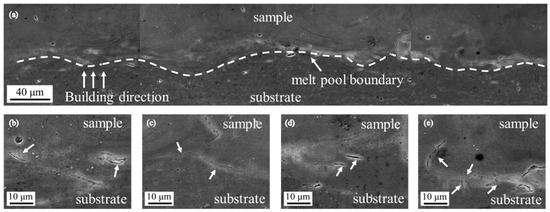 Figure 5 shows SEM images acquired on lateral surface of SLM-produced AlSi10Mg sample. Microstructural morphology at the joint between sample and building platform was investigated. Clear melt pool boundaries were indicated by white dashed lines in Figure 5a. Numerous cracks were observed near the joint and most of them are distributed on the sample side. The majority of observed cracks is propagated perpendicular to the building direction. A few cracks extending along the building direction were observed to cross the melt pool boundaries. Higher magnification of cracks was given in Figure 5b–e.