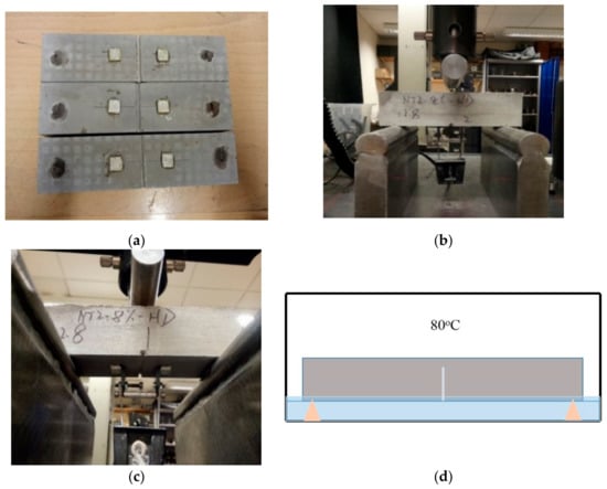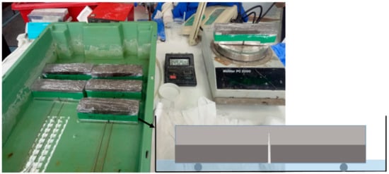 After 3 days of curing at 80 °C, the prismatic specimens were cracked under three-point bending for water sorptivity testing. Prior to cracking, the specimens were notched (1.5 mm depth and 2 mm width) at their base side in order to ensure the crack initiated in the center of the specimens (Figure 3a). The notched samples were then mechanically cracked using an Instron 30 kN static testing frame at a rate of 0.10 mm/min (Figure 3b). The crack width was controlled using a clip gauge that was attached to the base of the specimens through two knife edges fixed on both sides of the notch (Figure 3c). The cement prisms were loaded to a crack mouth opening displacement (CMOD) of 200 µm. The cracked specimens were then cured in the incubator for another 7 days at 80 °C in a sealed container containing water at a level of 2–3 mm above the base of the specimens, as shown in Figure 3d. The water was absorbed into the crack by capillary force to assist the healing process.