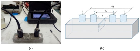 The ultrasonic velocity test used for crack depth measurement (a) the instrument PUNDIT-PL 200 used and (b) a schematic diagram of the crack depth measurement principle.
