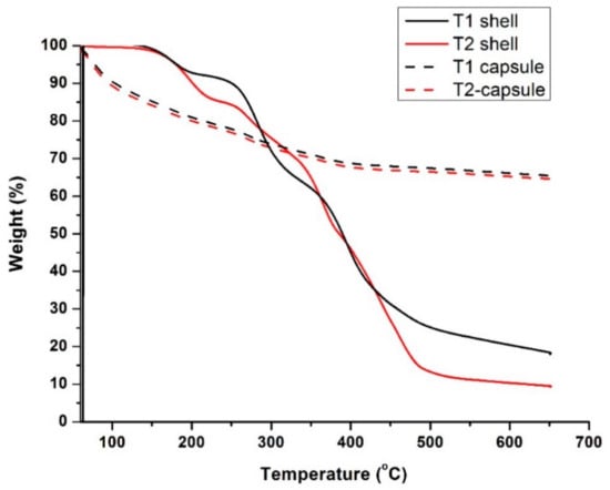 Figure 6 presents the thermogravimetric traces of the T1 and T2 microcapsules together with their shell materials. Both sets of traces displayed similar trends that showed the first weight depletion from the initial temperature of 50 °C and experienced a gradual weight loss over the following wide temperature range up to ~400 °C, reaching a residual weight of ~70% at 650 °C. On the other hand, the shell material alone for both microcapsules generally remained thermally constant up to ~160 °C and then decomposed gradually from ~150 to ~490 °C, finally reaching a residual weight of ~19% for T1 and ~10% for T2 at 650 °C. Similar trends in the thermogravimetric traces of polyurea-type microcapsule shells were reported in the literature [25,34]. By comparing the thermal behavior of the capsules and the shell materials, it can be deduced that the initial weight loss of the capsules from 50 °C can be mainly attributed to the water loss from the hydrous sodium silicate core. Sodium silicate hydrates can start dehydrating at the low temperature of ~40 °C and transform into metasilicate above ~240 °C [35]. The microcapsules are deemed to remain intact up to the initial decomposition temperature of the shell wall (T1 at 150 °C and T2 at 160 °C), which are far above the target temperature of 80 °C.