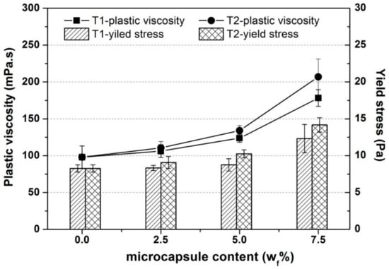 Figure 8 presents the variation in the plastic viscosity and yield stress of the oil well cement slurries with increasing additions of the T1 or T2 microcapsule from 0 to 7.5% at 20 °C. In general, T1 and T2 microcapsules showed similar influencing trends on the rheological properties. Increasing the dosages from 0 to 5%, led to a linear increase of the plastic viscosity and yield stress while a much more significant increase was observed with the higher dosage content of 7.5%. Similar trend was also reported by other researchers [16,22] in the same group who used spherical polymeric microcapsules. For a dilute phase, where the concentration of particles is low, the relative motion of fluid near and around them remains largely unaffected by the volume fraction of particles [22]. For such dilute phases, Einstein had found that their viscosity is correlated linearly with increasing particle concentration. As the volume fraction of microcapsules increases, it induces the so-called crowding effect [37,38,39]. The frictional contact force between the particles also increases and obstructs the movement of fluid around the particles, resulting in increased viscosity. The large particles with interfering sizes are crowded mutually and the small particles decreases the free space for large particles. The small particles filling the spaces between the large particles to reduce the free spaces which is usually larger than the particle size. Particles with different effective volumes when crowded can result in dead fluid trapped between them resulting in rapid decrease of the flowability of the suspension [40]. This explains the significant influence of the microcapsules on the yield stress for the 7.5% dosage. As the flowability decreased, a higher energy level was needed to initiate flow of the cement slurries, thus increasing the yield stress.