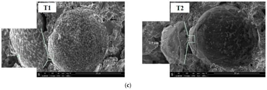 After an exposure of 14 days in saturated Ca(OH)2 solution (pH ≈ 13) at 80 °C, both types of microcapsules were able to retain their shell integrity, as shown in Figure 7, and hence the shell wall acted as an important protection layer for the cargo. The polyurea shells had good thermal stability as demonstrated by the thermogravimetric results above. Polyurea materials are also reported to have good resistance to alkalis [36], which enabled the microcapsules to survive in the high temperature and high alkaline condition. Hence, it can be concluded that both T1 and T2 microcapsules are suitable for use under the high temperature and high alkaline condition of oil well cement systems.