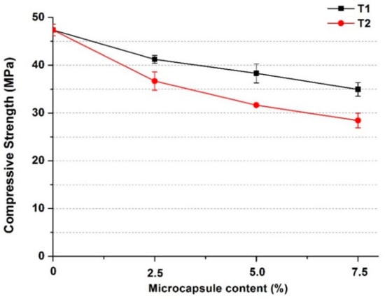 The compressive strength of oil well cement pastes containing a varying content, 0–7.5% by weight, of the T1 or T2 microcapsules after 3 days curing at 80 °C.