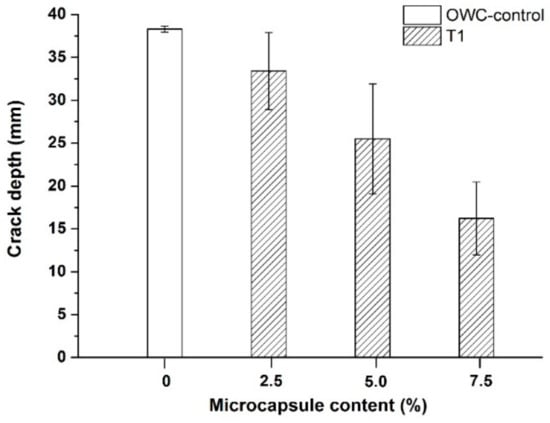 The results of the measured crack depths of the oil well cement samples after healing for 7 days at 80 °C are shown in Figure 11. All the cement samples containing microcapsules showed lower crack depths than the control samples after healing. Increasing the content of the microcapsules achieved greater reduction in the crack depth. Increasing the addition of the T1 microcapsules from 2.5% to 7.5% resulted in increased crack depth reduction from ~13% to ~58%. The increased crack depth reduction suggests that there was improved healing inside the cracks.