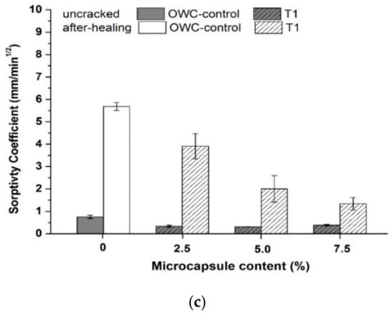 In addition, the hydrophobic polyurea microcapsule shell material appeared to reduce the sorptivity to some extent, as indicated by the water uptake measurements (Figure 12b) as well as the sorptivity coefficients of the uncracked samples (Figure 12c). The characteristics of reduced water absorbency of the cement matrix can be beneficial to its durability in water tightness.
