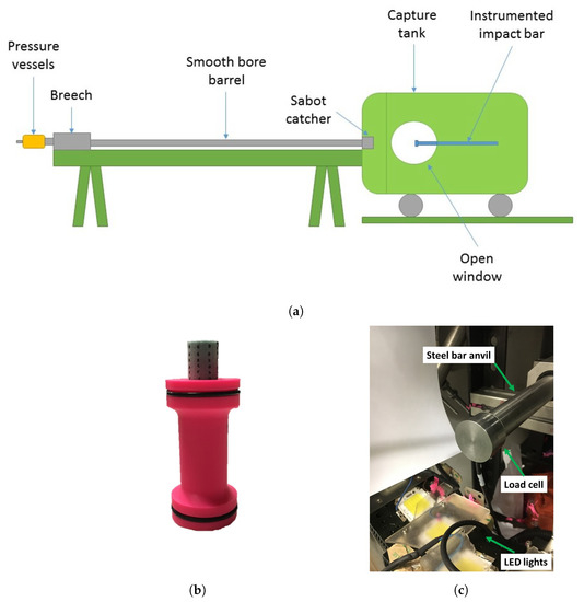 (a) Imperial College 50 mm gas gun; (b) sabot/specimen system for dynamic compression tests; (c) tip of the impacted steel bar.