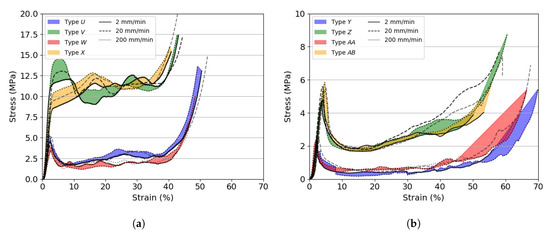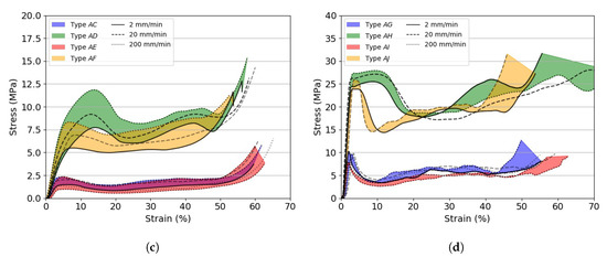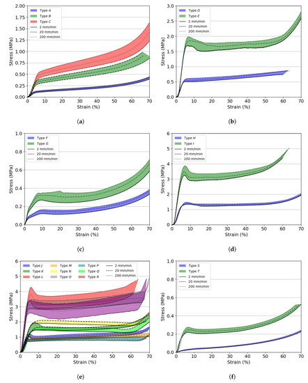 Figure 4 shows the compression stress vs. strain curves for the investigated foams tested at different quasi-static strain rates. Only one curve per material is shown for clarity purposes.