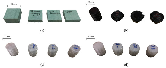 Figure 5 shows the compression stress vs. strain curves for the investigated 3D printed specimens tested at different quasi-static strain rates. The initial elastic compressive behaviour of 3D printed materials mainly depended on the precursor polymer and the infill density. However, contrary to what was observed while testing foams, in which the crush plateau was smooth and approximately stable at a value of , the plateau region for 3D printed specimens showed features similar to those observed for aluminium tubes tested in compression [27,28]. The stress vs. strain curves revealed smooth peaks and troughs, which could be associated with the folding of the cylindrical structure in a concertina mode. This phenomenon was more evident in stiffer and denser specimens than in compliant ones. Amongst the investigated materials, PLA had the highest collapse strength, which was calculated between 23 MPa and 27 MPa, depending on the test rate, for the specimens having a 30% infill density, followed by ABS, PA and CPE. The influence of the infill topology was minimal as far as was concerned. However, it was observed that specimens with a linear infill pattern had a more stable and longer yield with respect to specimens with a triangular pattern, which showed an earlier softening after yielding and a lower densification initiation strain for the same infill percentage. 3D printed specimens showed less sensitivity to the strain rate than foams, with increasing by as much as 14% for the investigated quasi-static rates. All 3D printed specimens plastically deformed upon compression. PA specimens were the only ones able to recover their initial cylindrical shape partially after removing the applied load. The lesser the infill density, the greater the shape recovery. Representative images of pristine and tested specimens are shown in Figure 6.