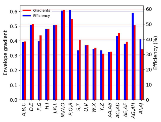 By plotting vs. and vs. , it was possible to identify which material would perform optimally given an amount of energy to be absorbed, stress and strain. Figure 7 shows representative energy absorbed and efficiency plots for two different materials. The trends observed for Types A, B, C and AC, AD were similar to those observed for the other investigated materials.