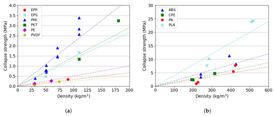 Collapse strength vs. density for the investigated materials (data from 2 mm/min compression tests). (a) Foams; (b) 3D printed.