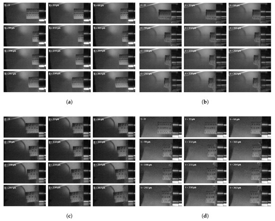 Series of snapshots from dynamic compression tests for selected materials. (a) Type G (Plastazote® HD60); (b) Type I (PET); (c) Type O (Rohacell® 110RIST); (d) Type W (3D printed ABS).