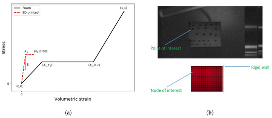 (a) Stress vs. volumetric strain of a virtual foam specimen; (b) definition of the points of interest for the experiment and the FE model.
