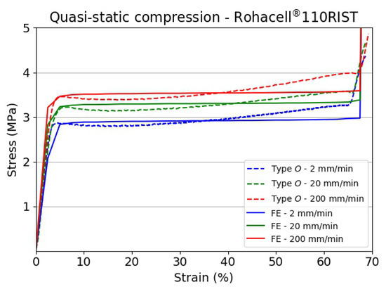 As mentioned in the previous sections, an inverse approach was adopted to determine the dynamic strength of the specimens via the FE method. The material parameters were iteratively varied until a close correlation between the numerical and experimental results was found. In order to establish the predictive ability of the material model used, quasi-static compression tests were simulated using the stress vs. strain relationship sketched in Figure 12a and values of X and Y as collected during the experimental campaign. A comparison between the FE simulations and experimental results for specimen Type O (Rohacell® 110RIST) is shown in Figure 14.